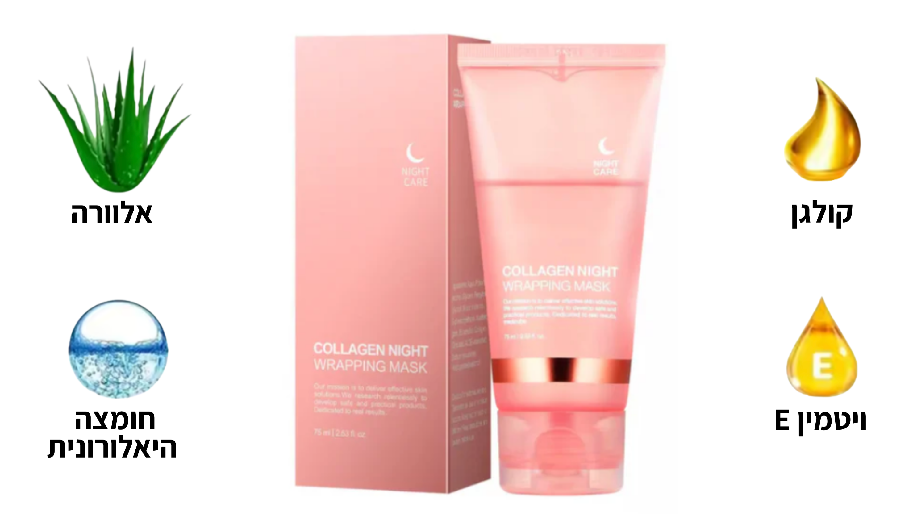 קולגן פעיל לתחושת מתיחה, חומצה היאלורונית ללחות עמוקה, ואלוורה להרגעה ולנינוחות.